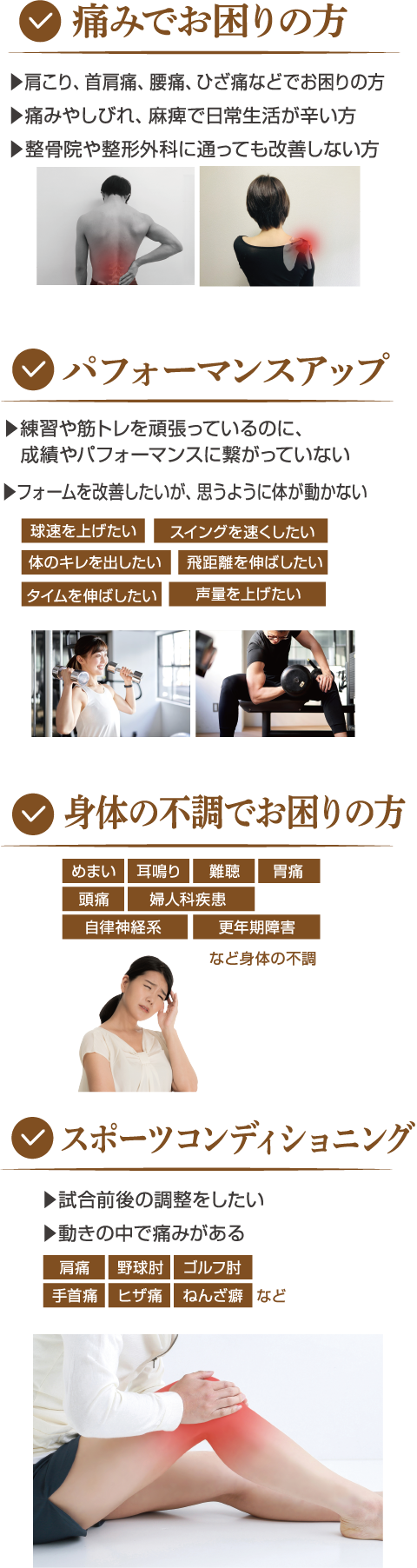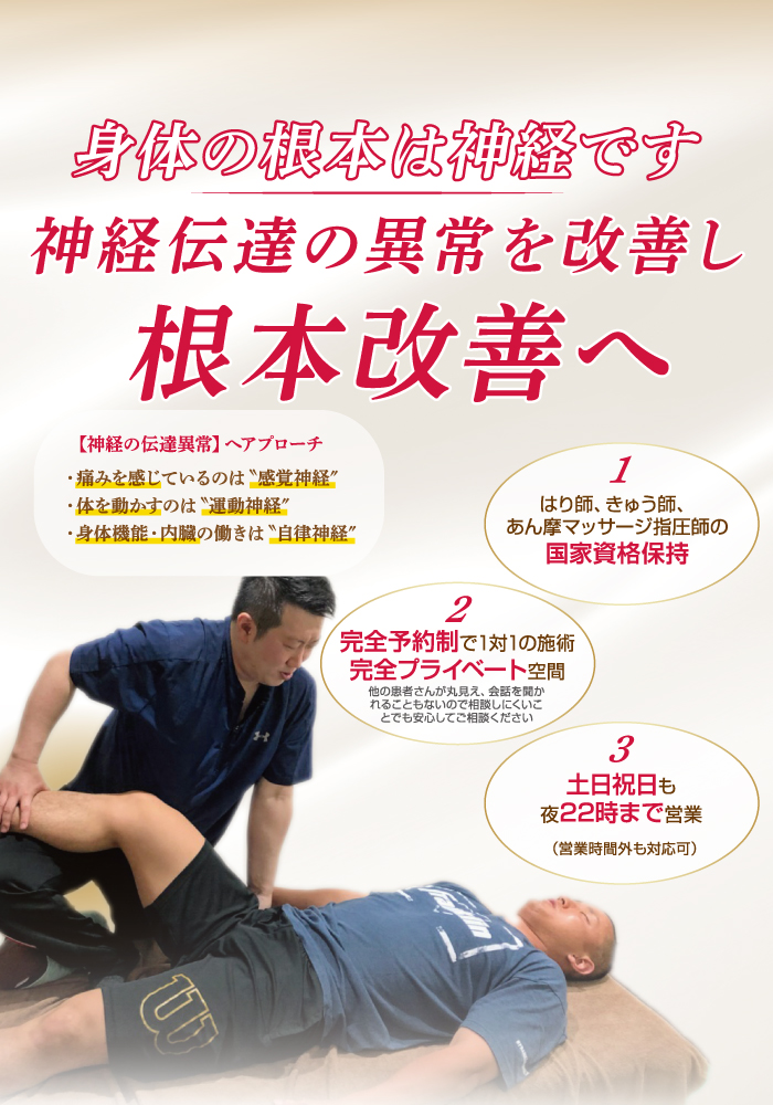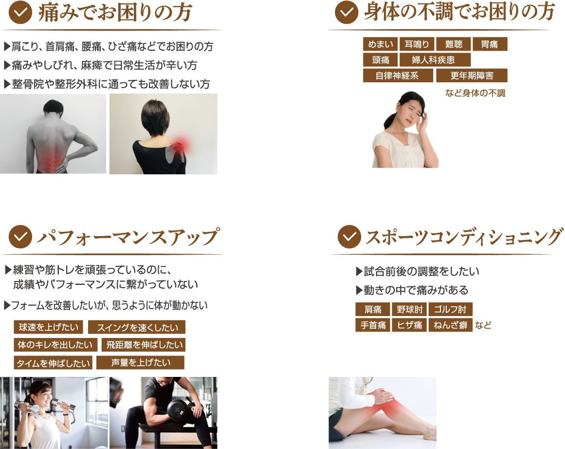 痛みや不調を引き起こしている原因を見つけ出し、根本改善から予防まで行います。